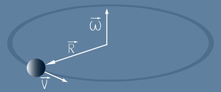 Ъгловата скорост се определя като пропорционална на векторното произведение между радиус-вектора на тялото R и вектора на линейната